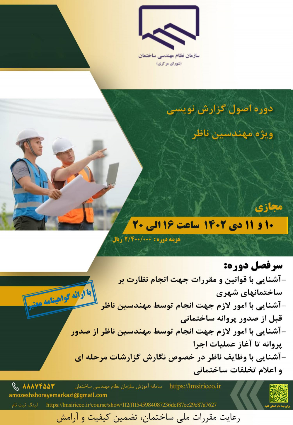 مدیریت آموزش نظام مهندسی ساختمان کشور در نظر دارد دوره " اصول گزارش نویسی ویژه مهندسین ناظر " را ساعت 16 الی 20 در روزهای یکشنبه و دوشنبه 10 و 11 دی ماه 1402 به صورت مجازی برگزار نماید.