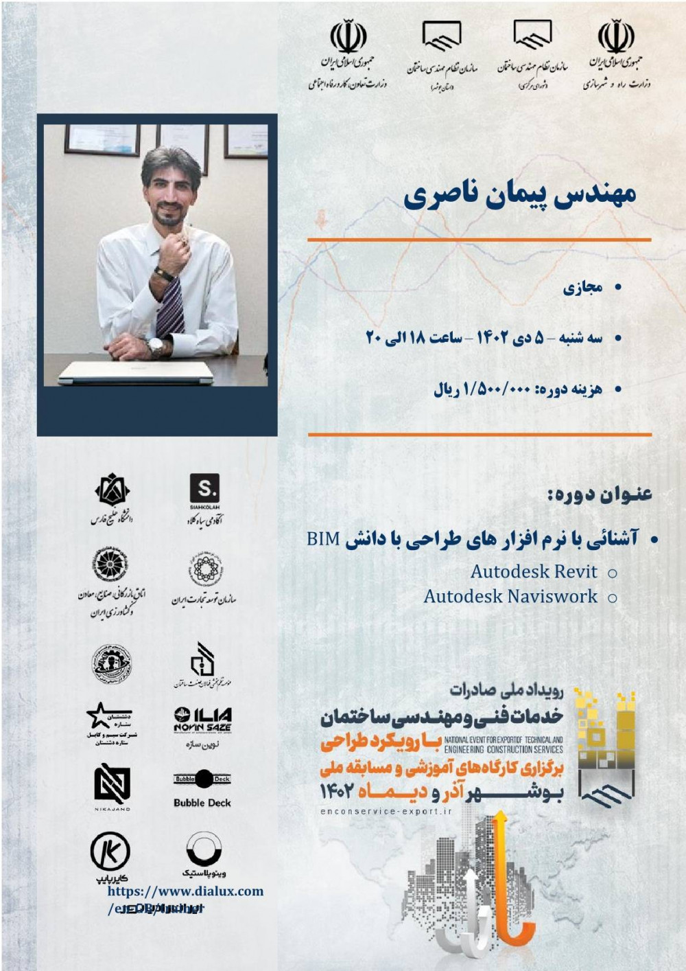 مدیریت آموزش نظام مهندسی ساختمان کشور در نظر دارد دوره "آشنایی با نرم افزار های طراحی با دانش BIM (Autodesk Revit, Autodesk Naviswork)" را از ساعت 18 الی 20 در روز سه شنبه 5 دی ماه 1402 به صورت مجازی برگزار نماید.