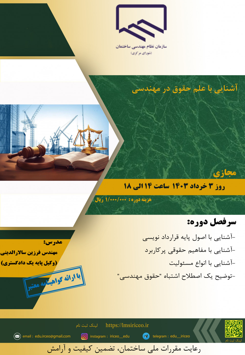 مدیریت آموزش نظام مهندسی ساختمان کشور در نظر دارد دوره " آشنایی با علم حقوق در مهندسی " را ساعت 14 الی 18 در روز پنجشنبه 3 خرداد ماه 1403 به صورت مجازی برگزار نماید.