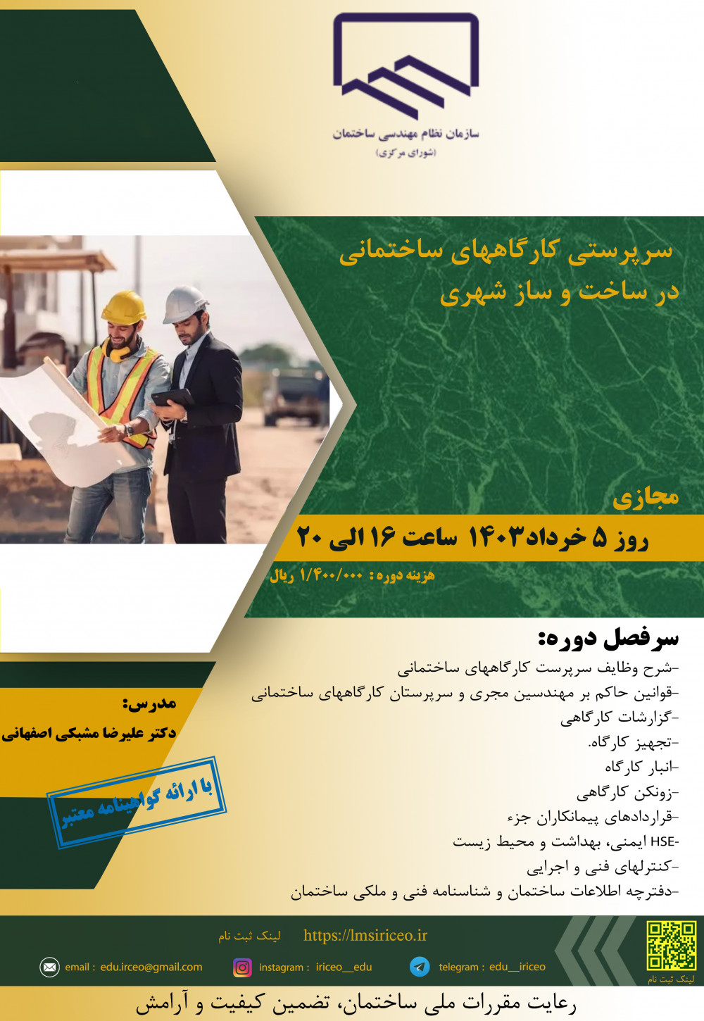 مدیریت آموزش نظام مهندسی ساختمان کشور در نظر دارد دوره " سرپرستی کارگاههای ساختمانی در ساخت و ساز شهری" را ساعت 16 الی 20 در روز شنبه 5 خرداد ماه 1403 به صورت مجازی برگزار نماید.