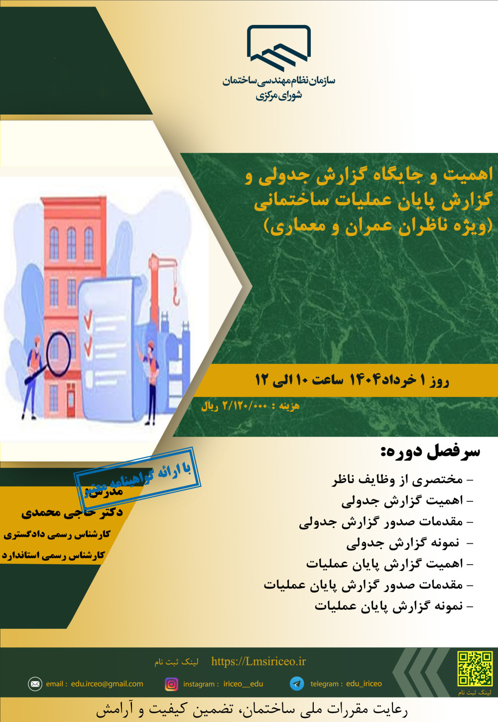 مدیریت آموزش نظام مهندسی ساختمان کشور در نظر دارد دوره آموزشی"اهمیت و جایگاه گزارش جدولی و گزارش پایان عملیات ساختمانی (ویژه ناظران عمران و معماری)" را ساعت 10 الی 12 روز پنجشنبه 1 خرداد ماه 1404به صورت مجازی برگزار نماید.