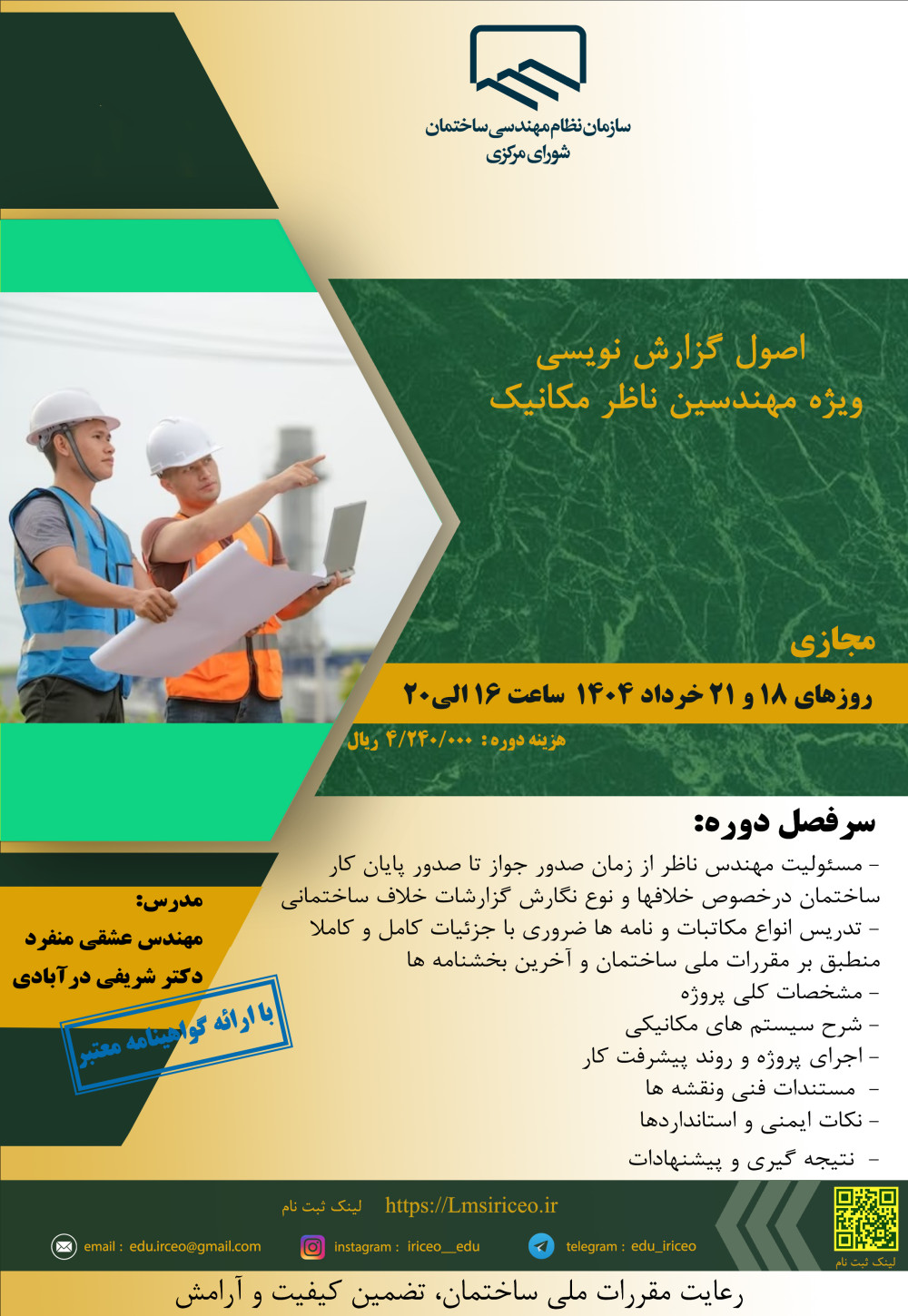 مدیریت آموزش نظام مهندسی ساختمان کشور در نظر دارد دوره آموزشی" اصول گزارش نویسی ویژه مهندسین ناظر مکانیک " را ساعت 16 الی 20 روزهای یکشنبه و چهارشنبه 18 و 21 خردادماه 1404 به صورت مجازی برگزار نماید.