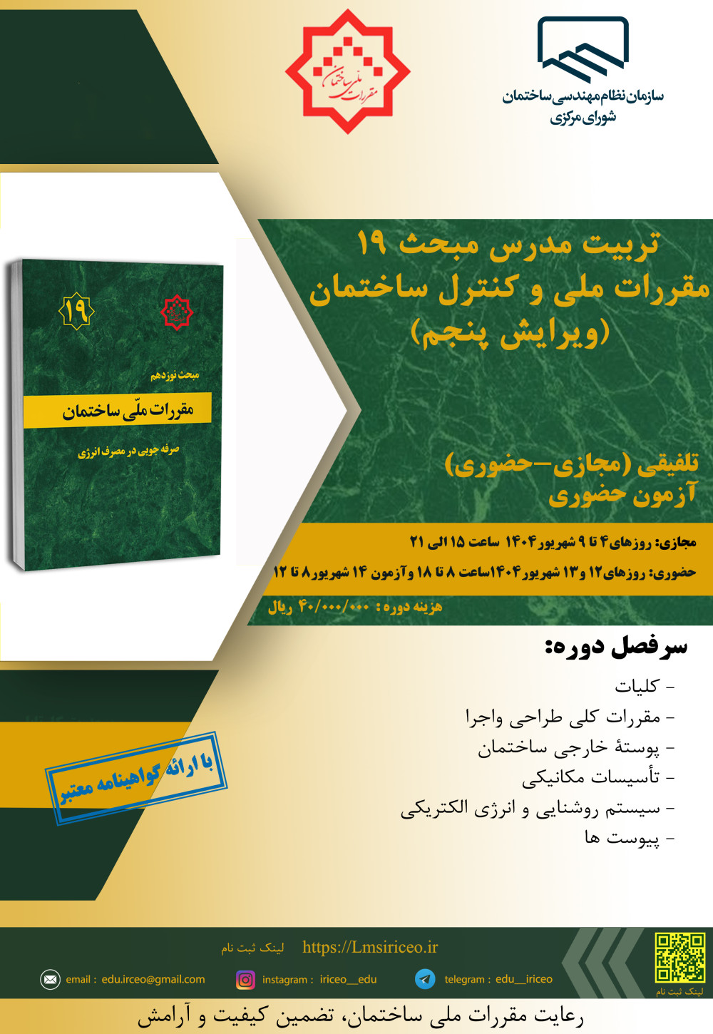 مدیریت آموزش نظام مهندسی ساختمان کشور با همکاری دفتر مقررات ملی و کنترل ساختمان در نظر دارد دوره آموزشی"تربیت مدرس مبحث 19 مقررات ملی ساختمان " ویژه مدرسان مبحث 19 مقررات ملی ساختمان را به مدت 55 ساعت (35 ساعت مجازی از روز 4 تا 9 شهریور 1404 از ساعت 15 الی 21، 16 ساعت حضوری روزهای 12 و 13 شهریور از ساعت 8 الی 18 و آزمون بعد از ظهر روز 13 شهریور برگزار نماید.