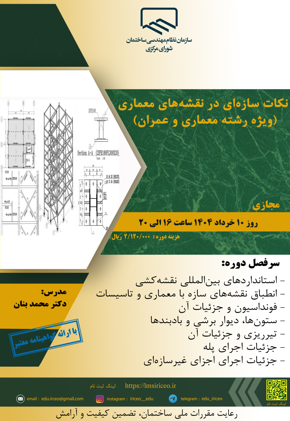 مدیریت آموزش نظام مهندسی ساختمان کشور در نظر دارد دوره آموزشی" نکات سازه ای در نقشه های معماری (ویژه رشته معماری و عمران) " را ساعت 16 الی 20 روز شنبه 10خردادماه 1404 به صورت مجازی برگزار نماید.