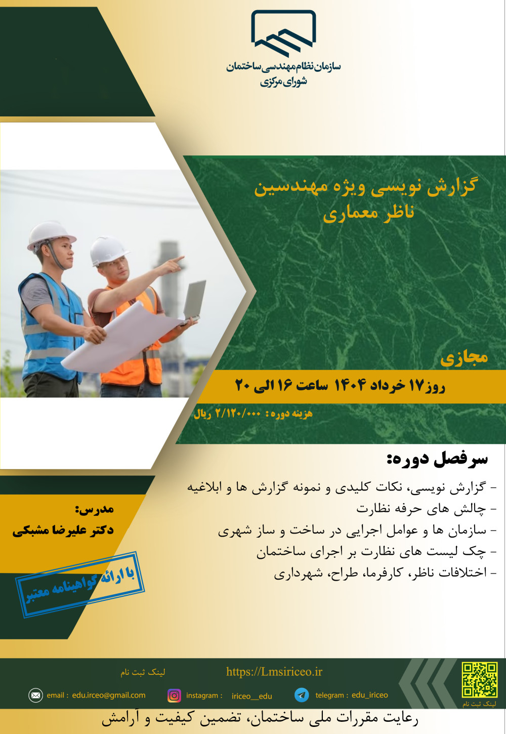 مدیریت آموزش نظام مهندسی ساختمان کشور در نظر دارد دوره " گزارش نویسی ویژه مهندسین ناظر معماری" را ساعت 16 الی 20 روز شنبه 17 خرداد ماه 1404 به صورت مجازی برگزار نماید.