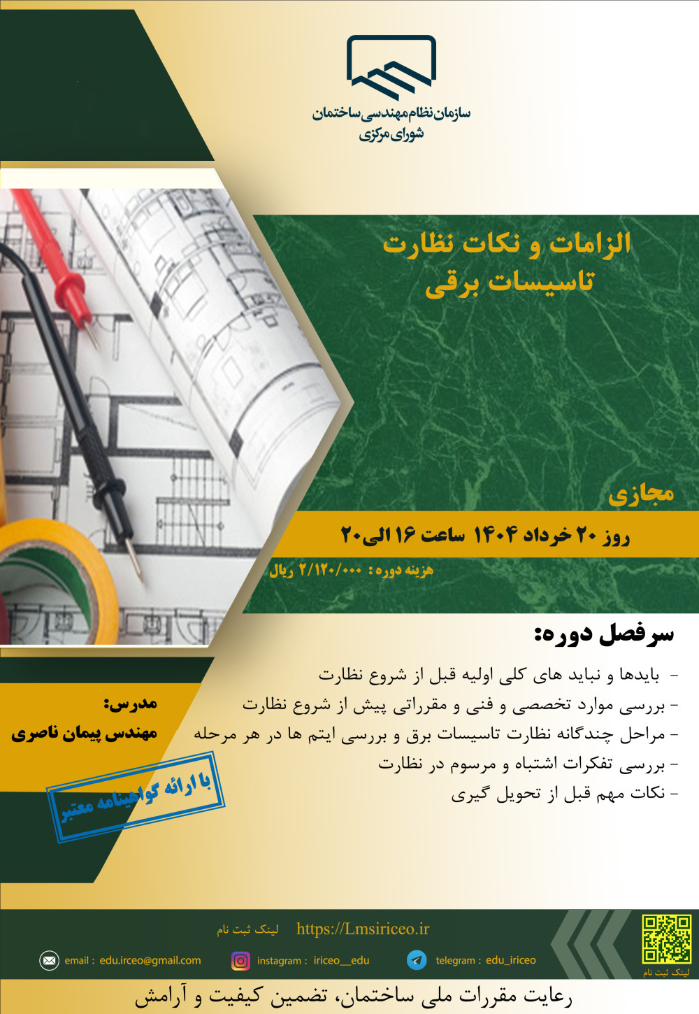 مدیریت آموزش نظام مهندسی ساختمان کشور در نظر دارد دوره آموزشی"الزامات و نکات نظارت تاسیسات برقی" را ساعت 16الی 20 روز سه شنبه 20 خردادماه 1404به صورت مجازی برگزار نماید.