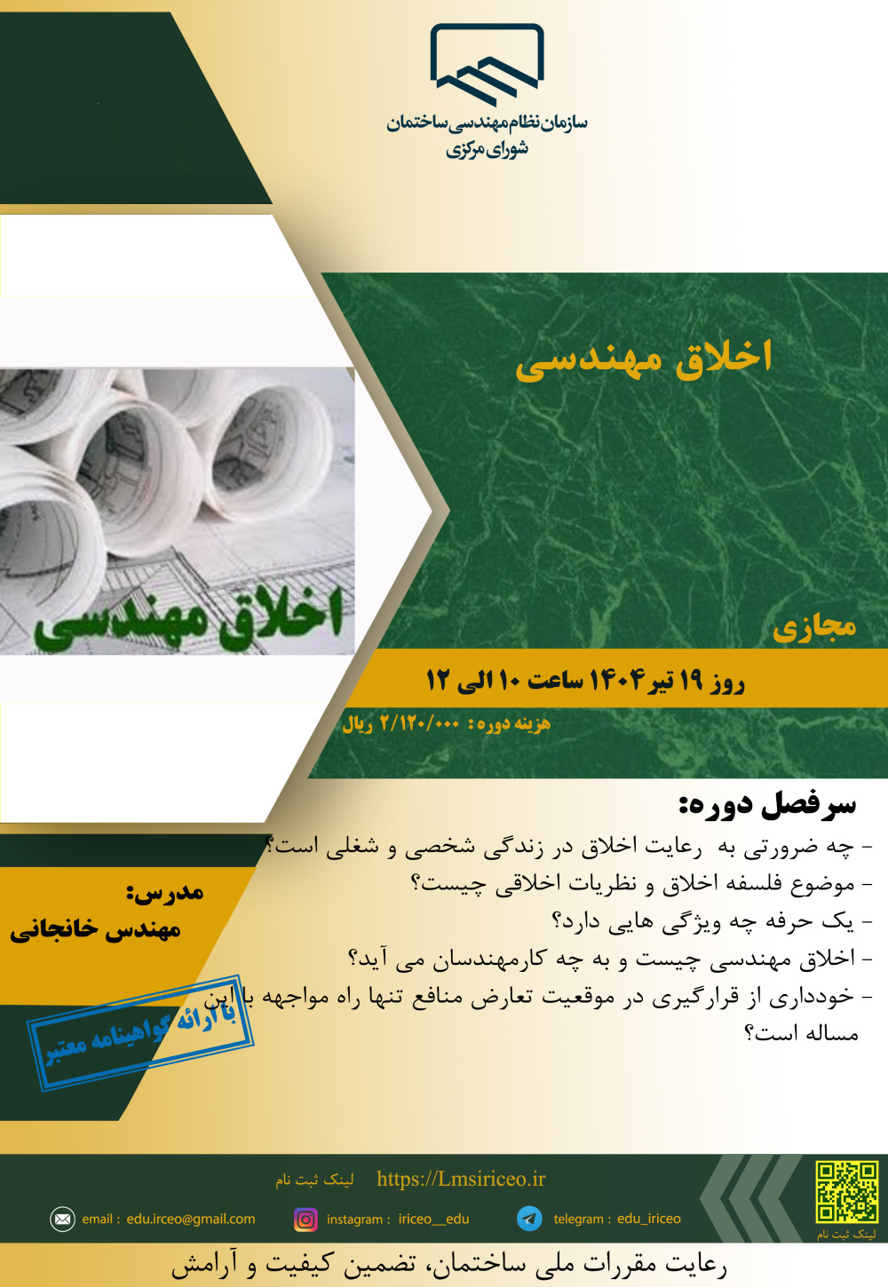 مدیریت آموزش نظام مهندسی ساختمان کشور در نظر دارد دوره آموزشی" اخلاق مهندسی" را ساعت 10 الی 12 روز پنجشنبه 19 تیرماه 1404 به صورت مجازی برگزار نماید.