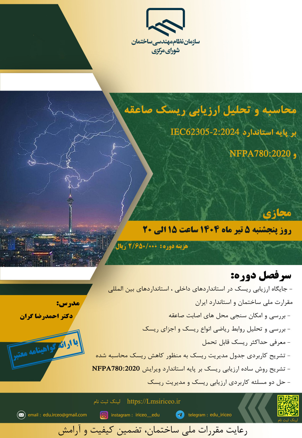 مدیریت آموزش نظام مهندسی ساختمان کشور در نظر دارد دوره آموزشی با عنوان "محاسبه و تحلیلِ ارزیابی ریسک صاعقه بر پایه استاندارد IEC62305-2:2024 و NFPA780:2020" را به مدت 5 ساعت از ساعت 15 تا 20 روز پنجشنبه 5 تیر ماه 1404 به صورت مجازی برگزار نماید.