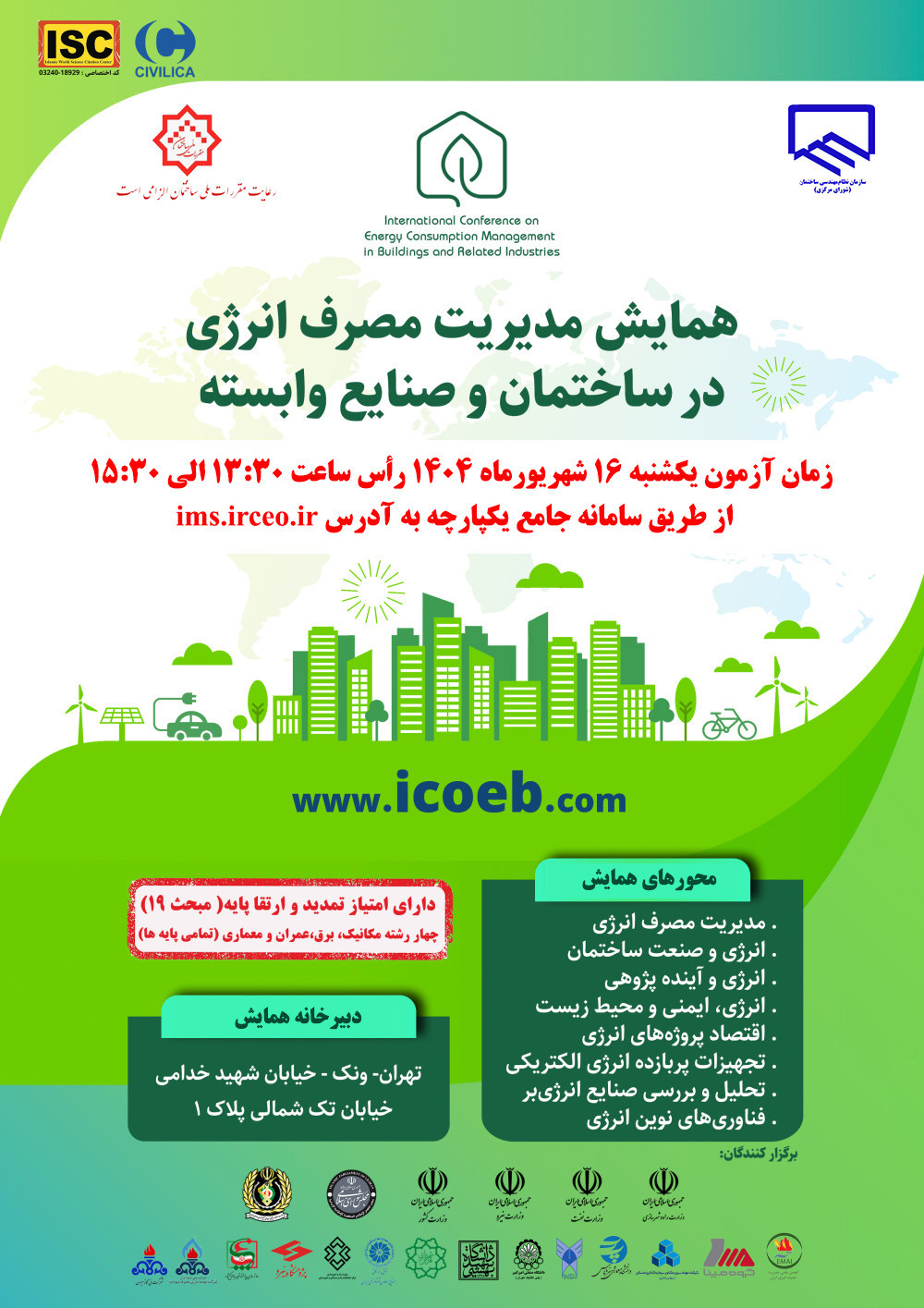 سازمان نظام مهندسی ساختمان با مشارکت سازمان نظام مهندسی ساختمان استان تهران در نظر دارد کنفرانس بینالمللی "مدیریت مصرف انرژی در ساختمان و صنایع وابسته" را روزهای روزهای یکشنبه، دوشنبه و چهارشنبه 26، 27 و 29 مردادماه 1404 به صورت مجازی برگزار نماید.