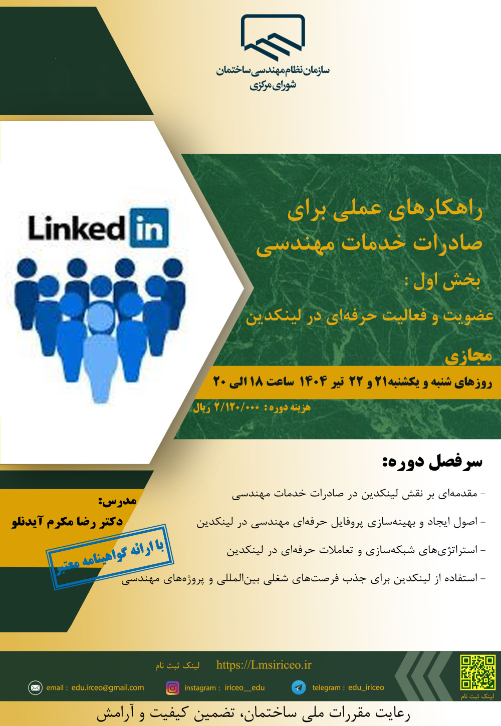 مدیریت آموزش نظام مهندسی ساختمان کشور در نظر دارد دوره آموزشی با عنوان " راهکارهای عملی برای صادرات خدمات مهندسی – بخش اول: عضویت و فعالیت حرفهای در لینکدین " را به مدت 4 ساعت از ساعت 18 تا 20 روزهای شنبه و یکشنبه 21 و 22 تیرماه 1404 به صورت مجازی برگزار نماید.