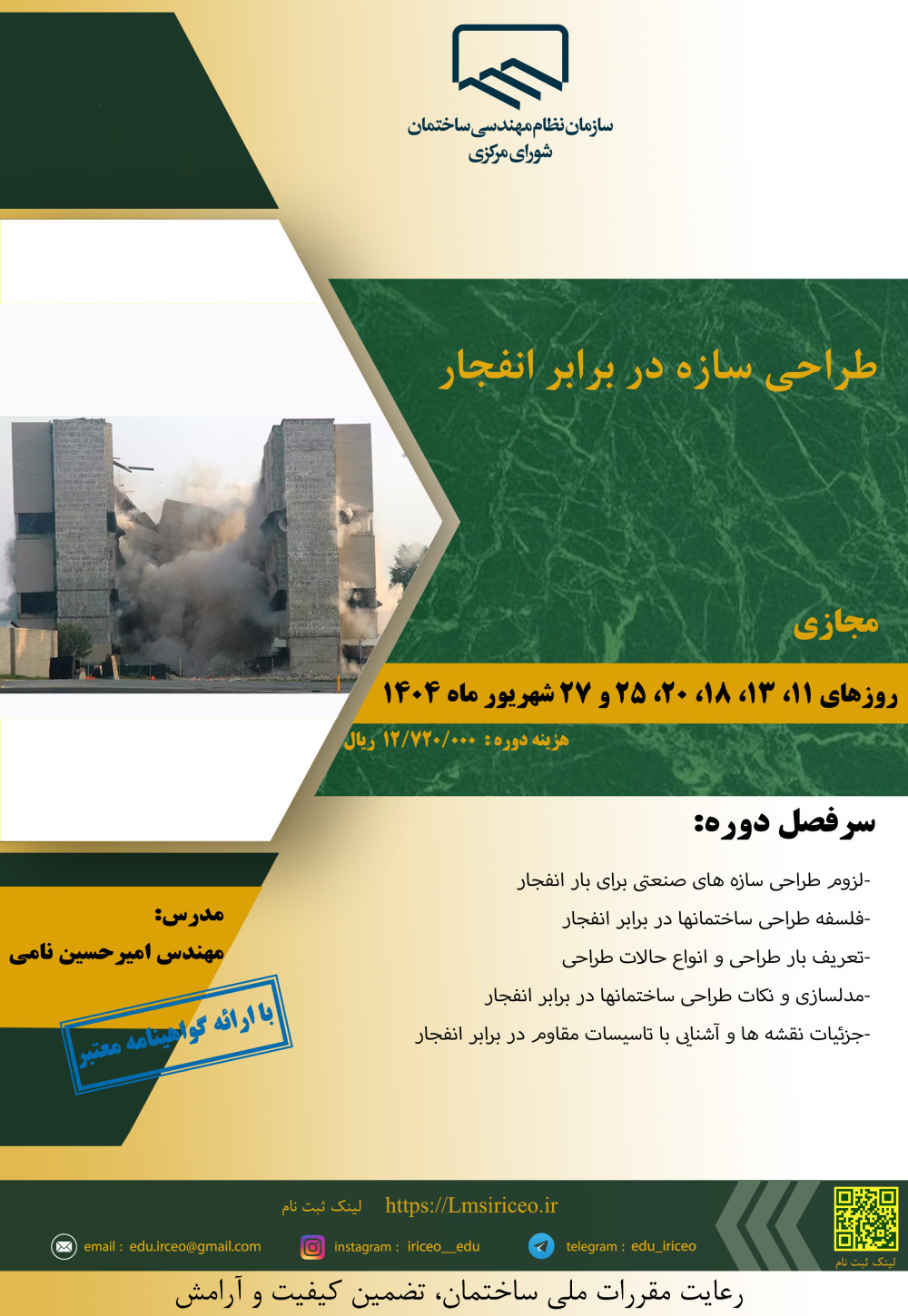 مدیریت آموزش نظام مهندسی ساختمان کشور در نظر دارد دوره آموزشی با عنوان " طراحی سازه در برابر انفجار " را به مدت 24 ساعت از ساعت 16 تا 20 روزهای سه شنبه و پنج شنبه 11، 13، 18، 20، 25 و 27 شهریور ماه 1404 به صورت مجازی برگزار نماید.