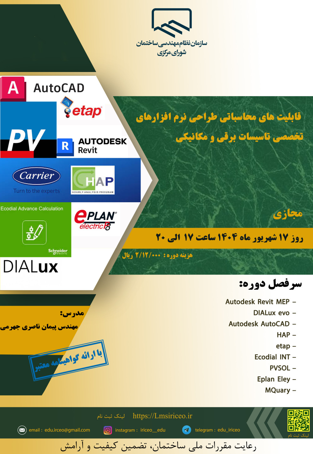 مدیریت آموزش نظام مهندسی ساختمان کشور در نظر دارد دوره آموزشی با عنوان " قابلیت های محاسباتی طراحی نرم افزارهای تخصصی تاسیسات برقی و مکانیکی" را به مدت 3 ساعت از ساعت 17 تا 20 روز دوشنبه 17 شهریور ماه 1404 به صورت مجازی برگزار نماید.