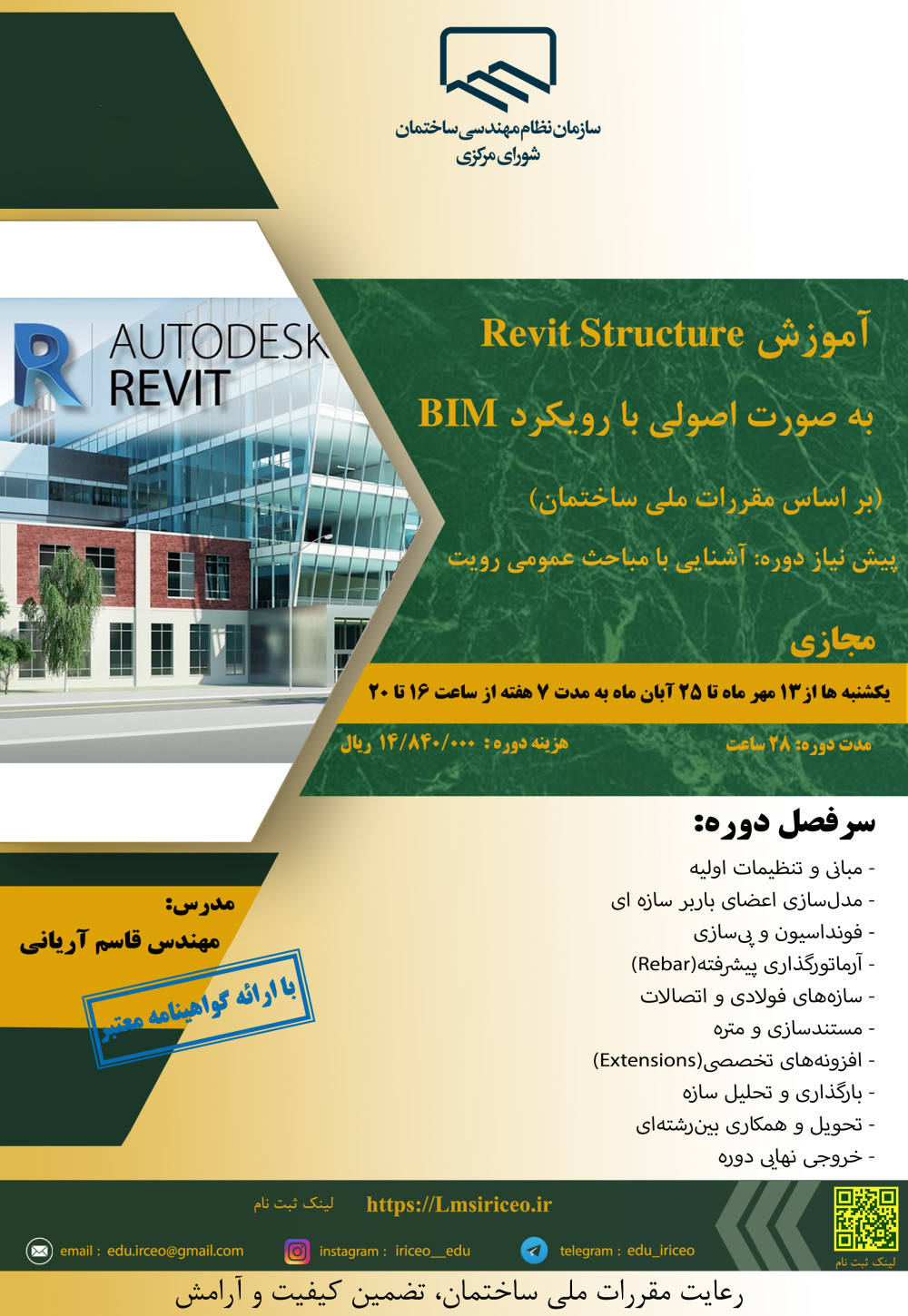 مدیریت آموزش نظام مهندسی ساختمان کشور در نظر دارد دوره آموزشی با عنوان " آموزش Structure Revit به صورت اصولی با رویکرد BIM (بر اساس مقررات ملی ساختمان)" را به مدت 28 ساعت از ساعت 16 تا 20 روزهای یکشنبه از 13 مهر ماه تا 25 آبان ماه1404 به مدت 7 هفته به صورت مجازی برگزار نماید.