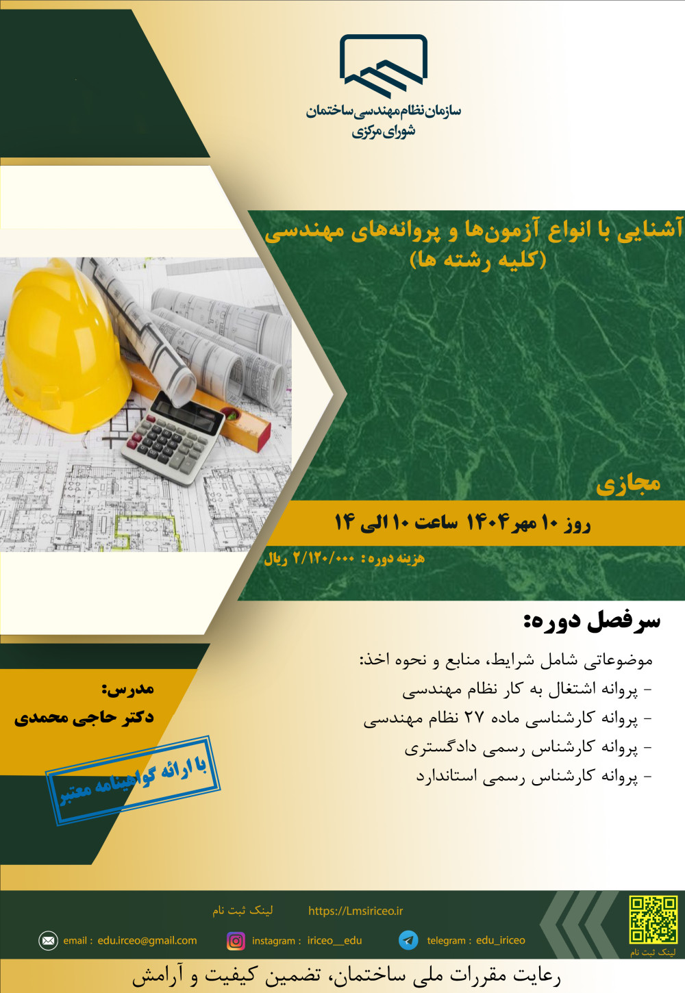 مدیریت آموزش نظام مهندسی ساختمان کشور در نظر دارد دوره "آشنایی با انواع آزمونها و پروانه های مهندسی (کلیه رشته ها) " را ساعت 10 تا 14 روز پنجشنبه 10 مهرماه 1404 به صورت مجازی برگزار نماید.