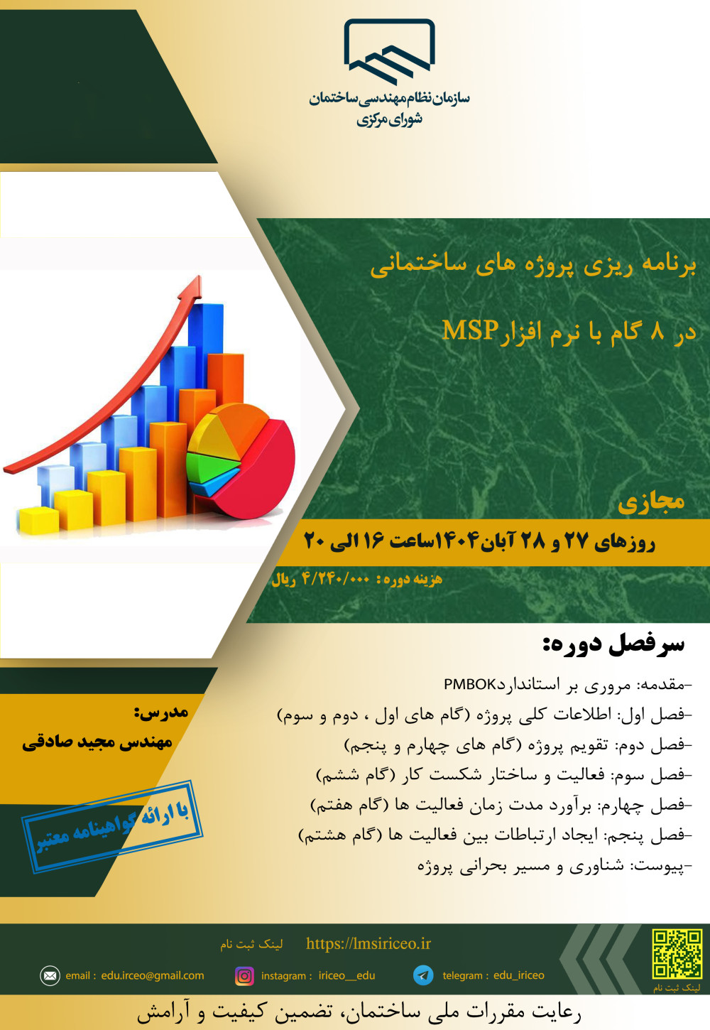 مدیریت آموزش نظام مهندسی ساختمان کشور در نظر دارد دوره کاربردی" برنامه ریزی پروژه های ساختمانی در ۸ گام (با نرم افزارMSP) " را ساعت 16 الی 20 در روزهای سه شنبه و چهارشنبه 27و 28 آبان ماه 1404 به صورت مجازی برگزار نماید.